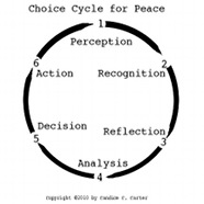 Making a decision that supports peace optimally happens in a cyclical process. It involves six deliberate steps that support best action. Ultimately, use of the process avoids or transforms conflict. Humans can learn the process as they mature. While young children lack the ability to perceive from another’s point of view, maturing youth and adults learn how to take another perspective and consider it in decision-making.